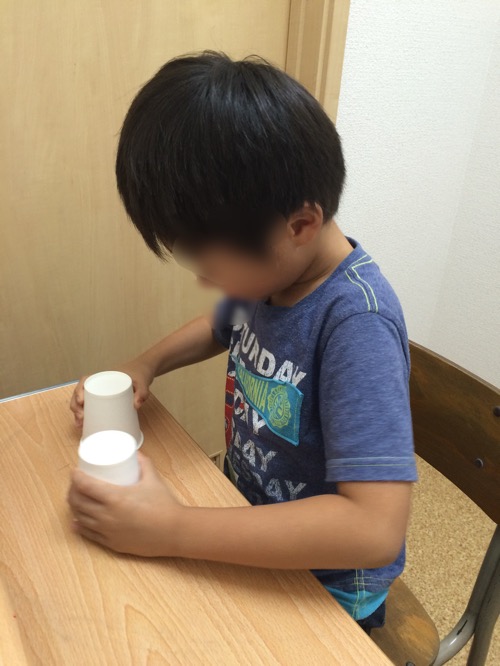 下の画像を見ても分かりにくいかもしれませんが、紙コップも立派な療育の道具に変身します。